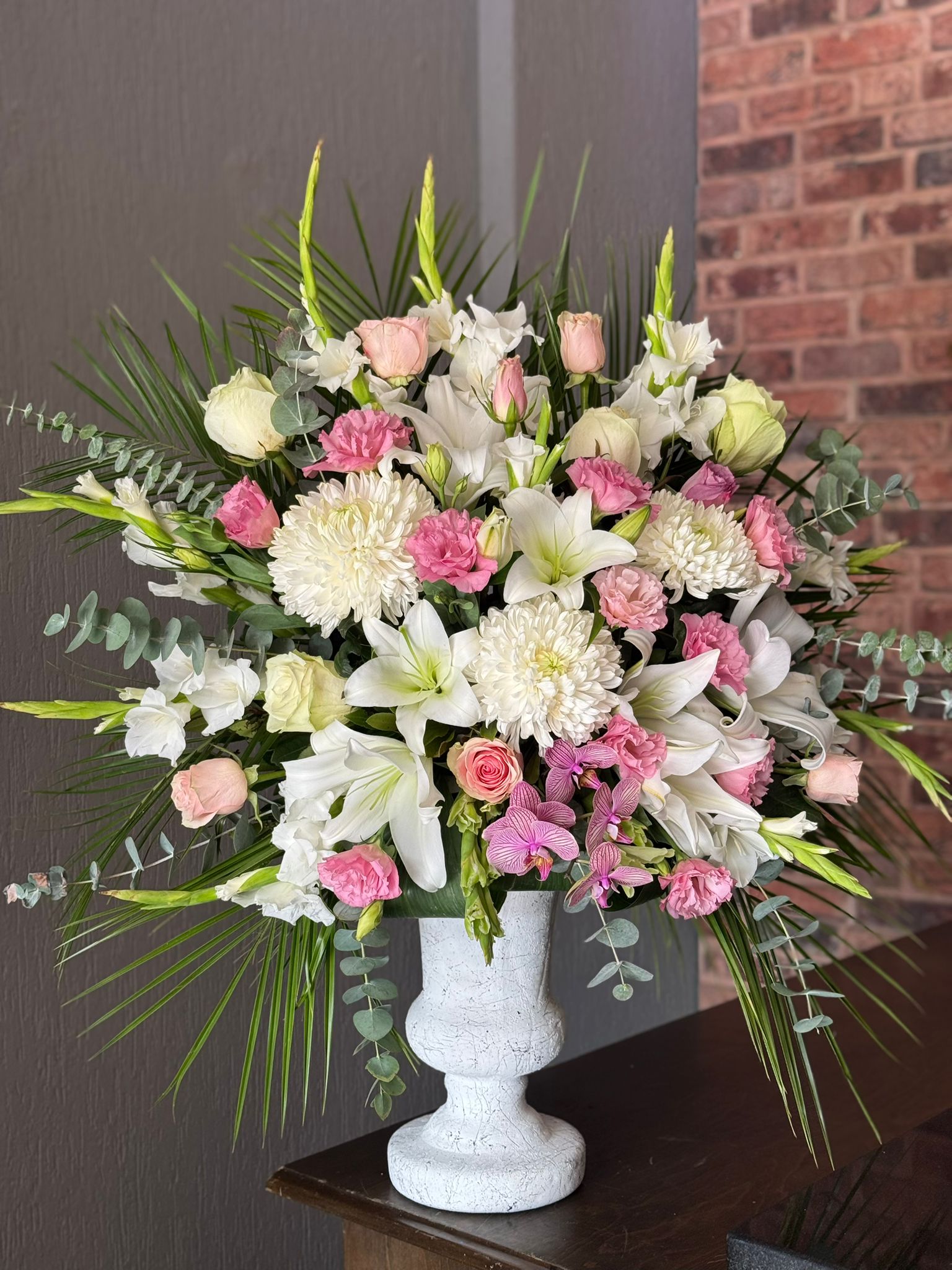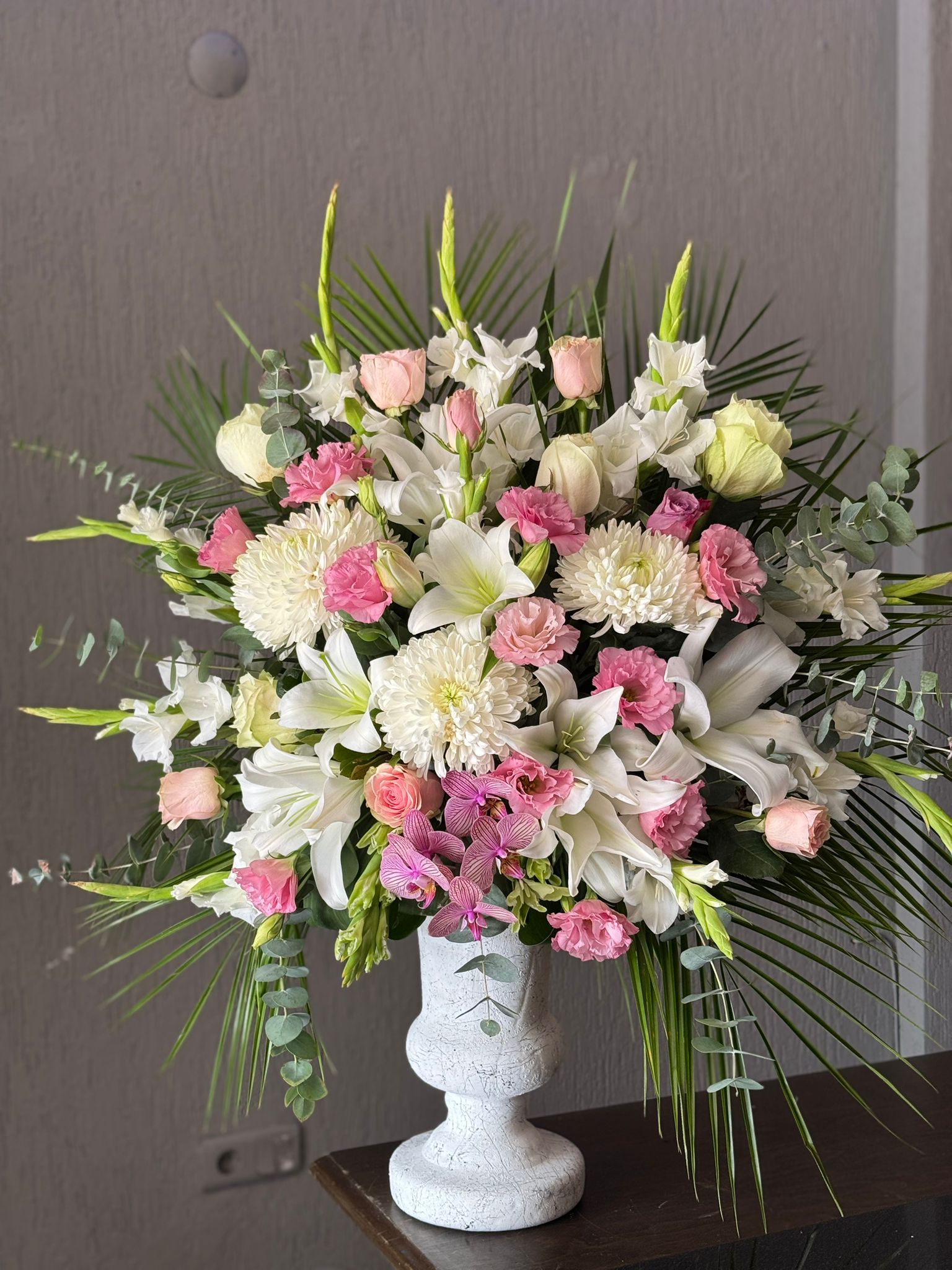Seramik vazo içersinde İthal çiçekler ile hazırlanır. Canlı çiçek aranjmanları mevsimsel olarak farklılık gösterebilir tasarım bütünlüğü bozulmadan hazırlanır. Ürünlerin tamamı canlı çiçeklerden oluşur